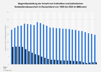 Für das jahr 2019 gab die deutsche bischofskonferenz die mitgliederzahl mit 22.600.371 an, was 27,2 % der gesamtbevölkerung entspricht. Im jahr 2016 waren 53 % der katholiken weiblich, 47 % männlich. Für das jahr 2019 gab die deutsche bischofskonferenz die mitgliederzahl mit 22.600.371 an, was 27,2 % der gesamtbevölkerung entspricht.